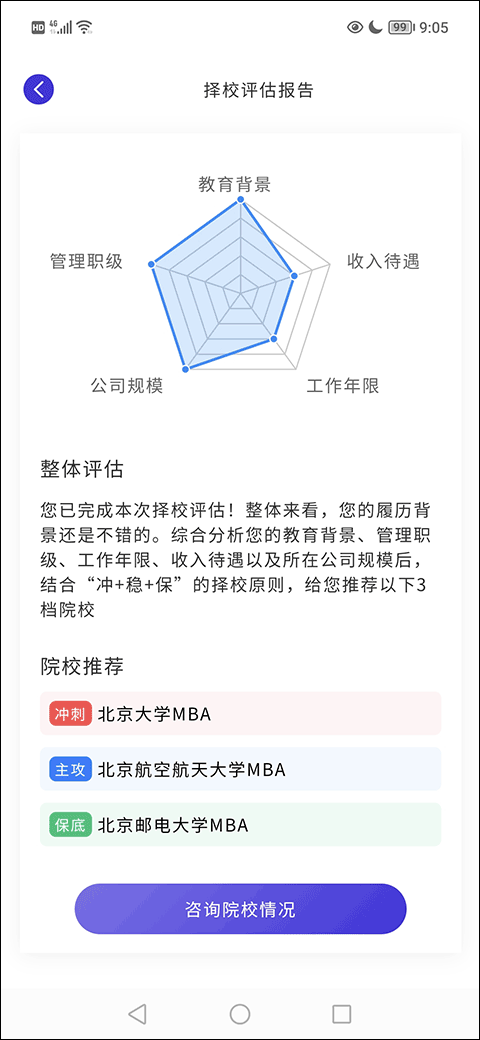 8、最后会生成一个评估报告的界面,你找到那个“查询院校情况”的按钮点一下,它会自动跳到微信小程序里给你看详细的评估结果。