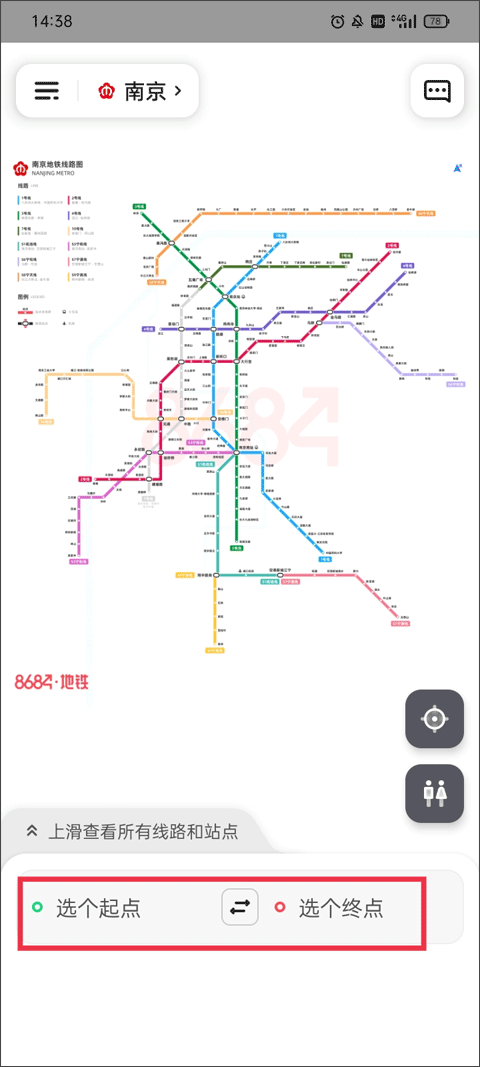 2、点击该图标,屏幕上便会显示全部地铁站点的卫生间位置详情。。你找到自己所在的那个站,点一下。