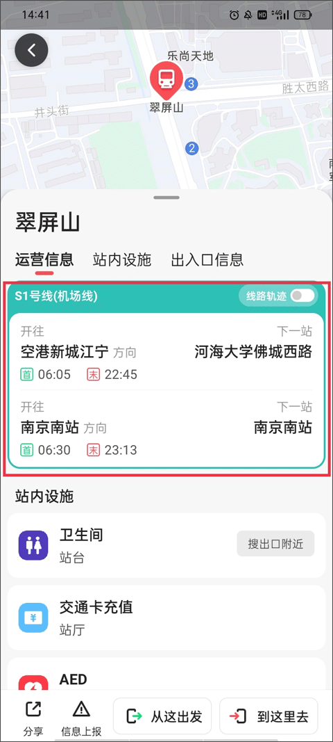 3、起点和终点都选好之后,详细信息就出来了。运营时间、站内有什么设施、每个出口通向哪里,都写得清清楚楚,信息给得特别足。