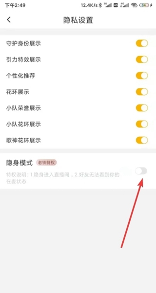 3、进来之后,就能看到“隐身模式”的开关了。打开它之后,你进直播间别人就看不到了,好友也看不到你的在线状态。根据自己的需要决定开不开哈。