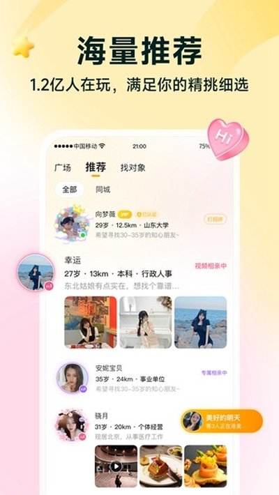 伊对是一款主打视频相亲的交友软件,提供更真实直接的恋爱互动方式。平台支持免费聊天与视频配对,每天拥有大量相亲场次,提升配对机会。通过多场景社交设计,帮助用户快速建立联系,减少传统聊天的不确定性。整体以高效率与真实性为核心,适合想认真找对象的用户使用。