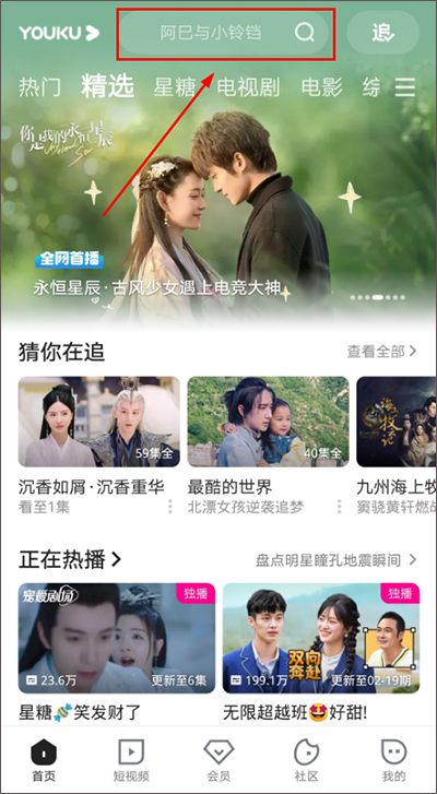 1、先打开你的优酷app并登录,在首页最上面就能看到一个搜索框,在里面输入你想看的电视剧名字。