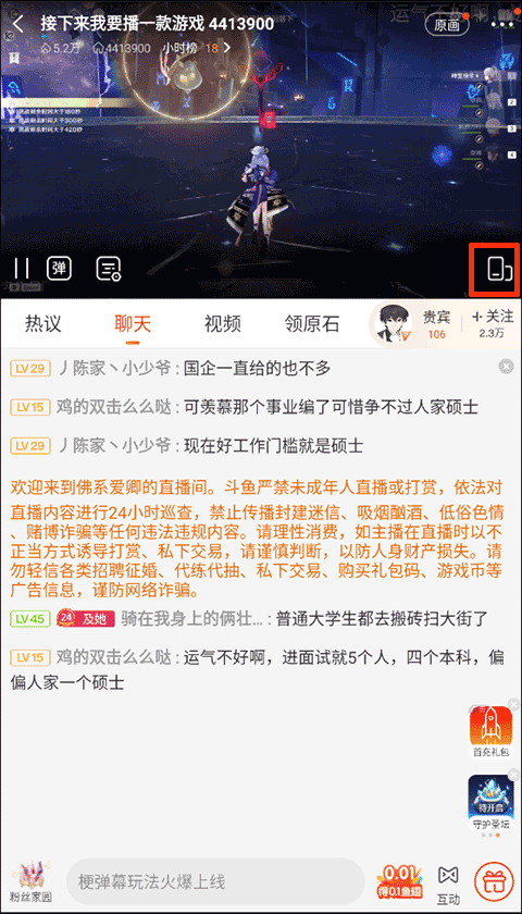 2、进到直播间里,想全屏看的话,就用手指在屏幕上轻轻点一下,下面会弹出来一个工具条,看到那个横屏的标志没,点它。