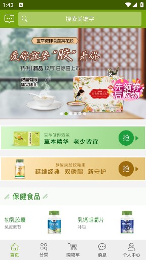 3、在最常用的“首页”上,顶部的搜索框非常方便,心里有目标产品的话,直接输入名字就能找到。当然,你也可以像逛街一样随便看看,这里会展示保健食品、健康家居用品以及日化护肤等各种热门分类。