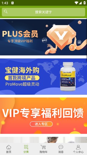 宝健商城绿色版v3.9.4来啦!用手机号或账户就能轻松登录,直达清爽主界面。底部功能区一目了然,“首页”、“分类”、“购物车”、“消息”随心切换。首页顶部的搜索框超级好用,想买什么直接搜,懒得打字?那就随便逛逛,各种好物分类清晰,总有惊喜等着你发现!