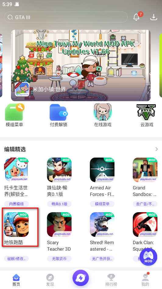 1、先从咱们这儿把PlayMods最新版给下好装上,打开软件,找到你想玩的游戏。这里就拿地铁跑酷举个例子。