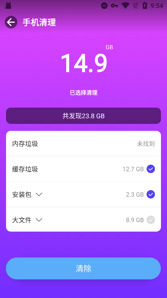 2、稍微等它扫描一下垃圾文件,扫描完直接点清除。这么一来,之前下载游戏留下的一些乱七八糟的残留文件就都给干掉了。