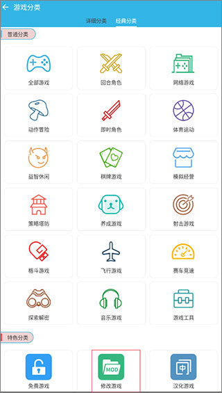 3、在分类列表里划拉一下, 找到“特色分类专区”这一栏, 所谓的修改版游戏就藏在这里头。