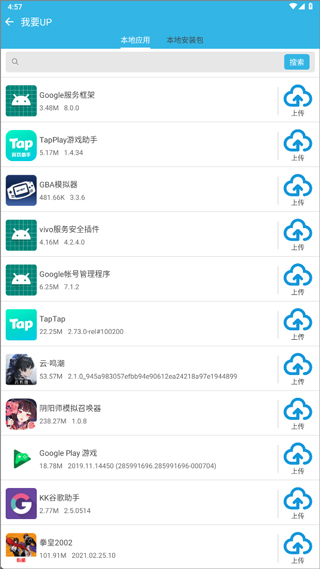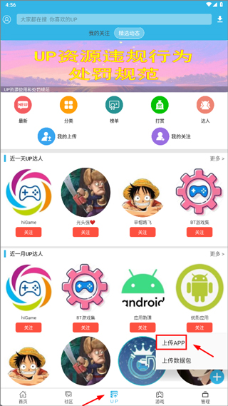 1、还是看底下那排导航栏, 中间有个“UP”按钮, 点它。进去了之后看右边, 有个加号图标, 点一下选“上传APP”。