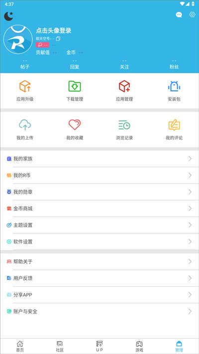 1、打开软天空, 先把你的号登录上。然后看右下角, 有个“管理”按钮, 点进去再找“我的家族”。