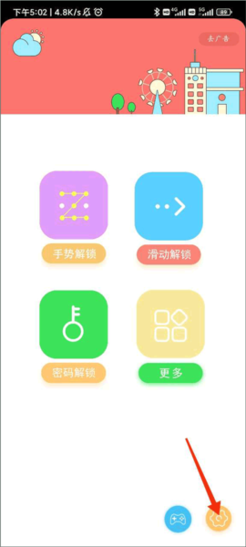 1、打开锁屏大全这个APP,找到主界面右下角那个黄色的齿轮图标,点它。