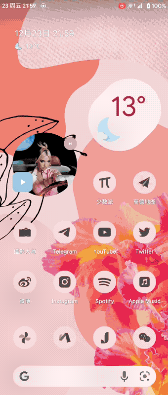 在Android 13里,Google对那个“正在播放”的通知栏卡片做了大改,还提供了接口给开发者适配。椒盐音乐第一时间就跟进了这个新特性,不仅有波浪形的播放进度条,还有大大的暂停/播放按钮。