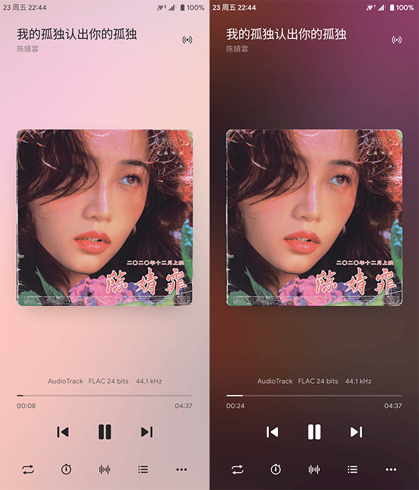 椒盐音乐内置了浅色与深色两款播放界面主题,用户既可以在“设置 > 用户界面”的“播放界面”选项中手动切换,也可以让它随系统主题自动变更。。根据我一下午的实测,两个界面都做得非常漂亮,一度让我犯了选择困难症。