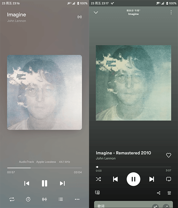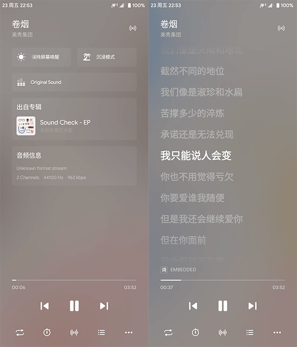 3、再来看看播放界面。这个界面分成了两部分,一边是专辑封面,另一边是歌词,这样设计听歌的时候就不会显得太单调。在专辑封面的那一面,会清楚地标出歌曲的格式和码率,对于有点追求的音乐发烧友来说,这个小细节还挺贴心的。播放的时候背景是那种高斯模糊的流光效果,你还可以在设置里调整流光的效果,比如颜色主题和流光的强弱。