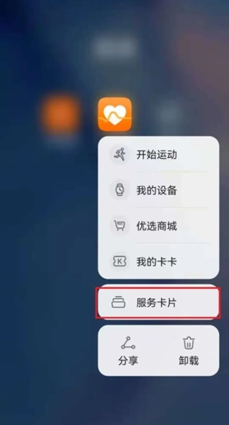 这个很简单,在手机桌面找到“运动健康”的图标,用手指长按它,会弹出一个菜单,找到“服务卡片”点一下就行。