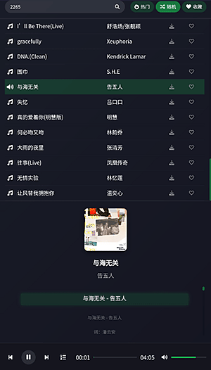 4、当然也少不了搜索功能,顶上那个搜索框就是,想听什么直接打字搜就行,反应很快。