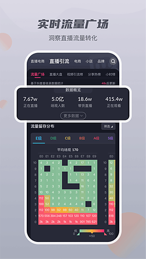 3、能帮你找到那些爆款直播间,实时看直播流量大盘,数据大屏跟看股票似的,还能从好几个角度分析流量构成。