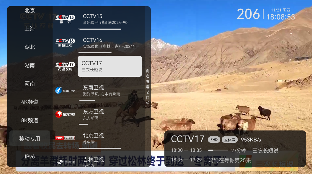 1、先进到软件里,用遥控器的OK键或者手指点一下屏幕,把菜单列表叫出来。在列表里仔细找找,能看到一个“移动专用”的分类。