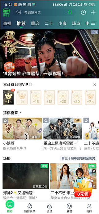 2、登录成功后,主界面就出来了。底下那排导航栏看清楚了,有“推荐”、“随刻视频”、“会员”、“发现”、“我的”这五个区。推荐页嘛,就是各种热门电视剧的大杂烩,官方主推的都在这。哦对了,这里还有个签到活动,每天点一下,攒够天数能白嫖会员,羊毛虽小也是肉啊!