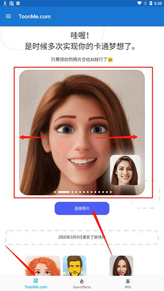 1、先把App下好安装完,打开它。一进去主界面你就能看到,左右滑动可以切换不同的迪士尼特效模板,挑一个你顺眼的,然后去选照片。