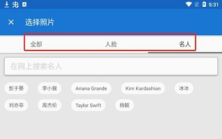 2、选照片的路子挺多的,你可以在“全部”那个分类里慢慢翻,也可以直接用它识别好的“人脸”来选,当然也可以玩点花的,直接选“名人”,用明星的照片。