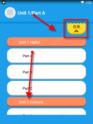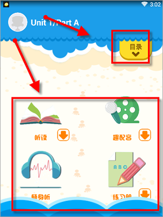 4、选好书本之后,主界面就变成这样了,你可以根据需要从四个不同的模块开始学习。划重点,右上角还有个目录按钮,可以让你自己选想学的具体板块。