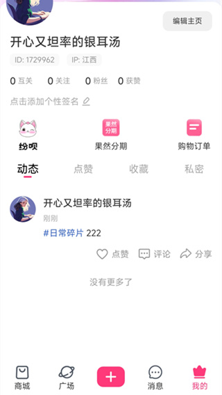 3、发布成功后可以到“我的”页面中查看自己已经发出的所有动态消息。