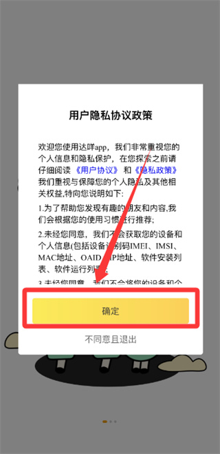 1、打开达咩app后先认真阅读隐私协议政策再点击“确定”以进行下一步。