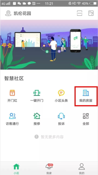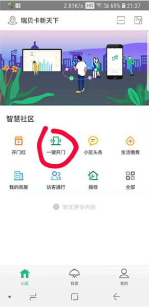 1、在APP主界面的“小区”这个板块里,找到“一键开门”按钮,只要你在门5米范围内,点一下就能开。不过你要是觉得每次都得先打开APP再点有点麻烦,那咱可以给它设个快捷键。