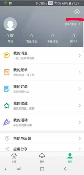5、现在回到“1号社区”APP,切换到“我的”界面,看到右上角那个小小的“设置”图标没?点它。