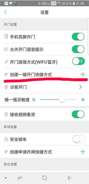 6、在设置列表里,你会看到“创建一键开门快捷方式”,旁边有个“+”号,点一下。