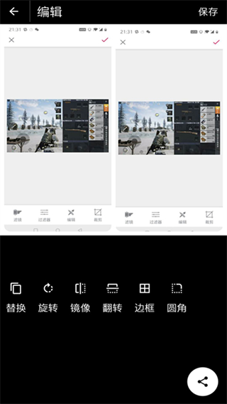 * 强大的照片编辑功能:裁剪、滤镜效果、贴纸、文字(多种字体)、边框、图层、涂鸦、祛斑、去红眼、美白、脱色、调节亮度/颜色/锐度等。