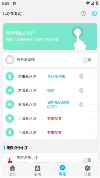 实测下来,它提供了一个悬浮球菜单,可以自定义一些常用操作,比如模拟左滑右滑、点击长按。这样就不用每次都得先进到App主界面去启动任务,方便多了。