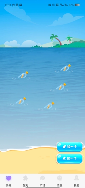 1、漂流瓶交互:主界面就是一片“沙滩”,你可以在上面随便扔瓶子或者捡瓶子,这种随机的聊天方式真的很有趣,也完全没压力。