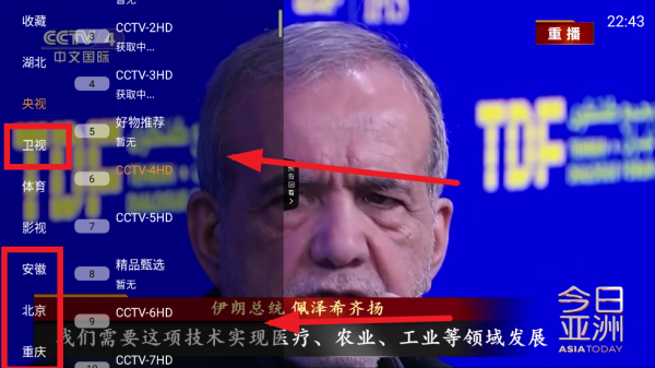 1、操作逻辑差不多,还是先按一下屏幕,会弹出选项。你看这张图,红圈里的两个地方都能切换,不过想直接看卫视的话,建议点“卫视”那个分类,更直接。