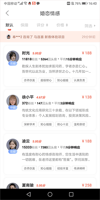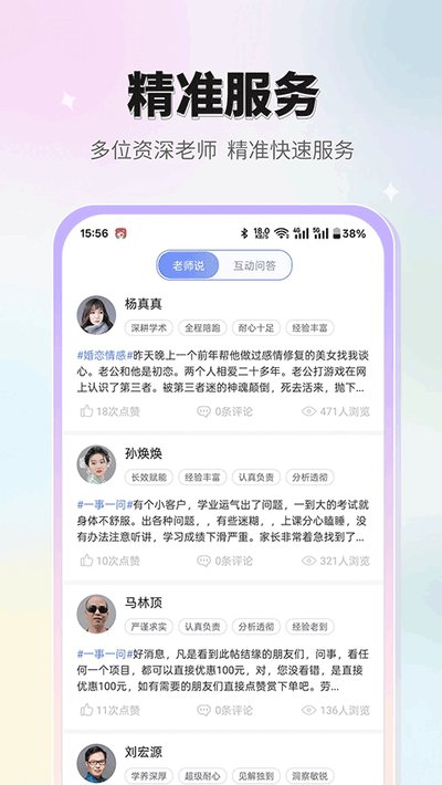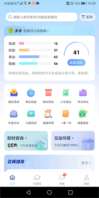 4、主界面功能挺清晰的,不管你是想问感情还是问事业,直接在里面找对应的大师开聊就行。