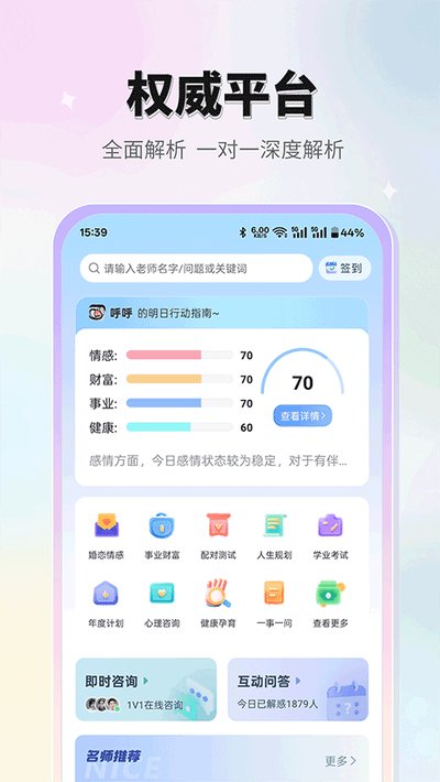 这App现在全名叫“高人汇咨询app”,简单说就是把老祖宗那套周易文化跟互联网结合起来,搞了个真人在线咨询平台。里面蹲着几百个号称资深的大师,业务范围挺广,从八字算命、风水调理到起名择日、塔罗占星啥都有。不管你是想看姻缘、问财运,还是操心孩子健康,基本都能找到对应的服务。跟大师沟通的方式也多,可以一对一私聊,也能看直播互动,或者直接扔问题。他们还承诺不满意能退款,隐私也给你兜着。另外还有卖开运小玩意儿和周易课程的,一条龙服务了属于是。