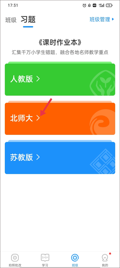 1、点一下底下菜单栏里的【班级】,切换到习题页面。这里能看到人教版、北师大版和苏教版这些教材,根据需要选一个。