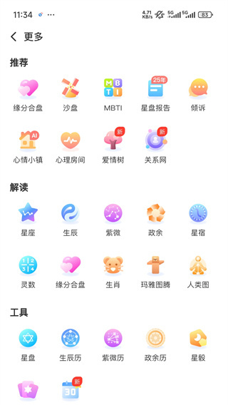 1、打开测测星座app后先点击“更多”进入分类页面中。