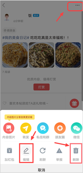 2、在你的主页里找到你之前发过的帖子,点击它。进入帖子页面后,注意看右上角有个“…”的按钮,点一下,就会弹出删除或者编辑的选项,根据你的需要操作就行了。