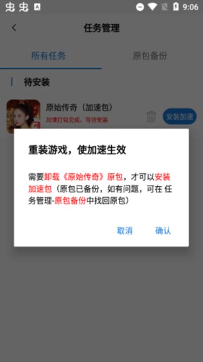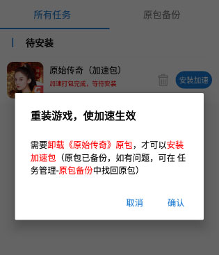 2.它的工作原理有点绕,但很稳。选中一个App后,它会自动给你生成一个备份包和一个加速包。你需要做的就是卸载原版,再安装它生成的那个加速版。