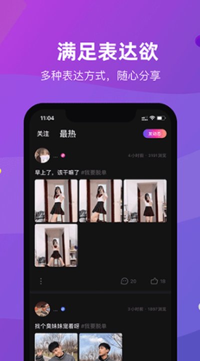 4、有个类似朋友圈的动态广场,可以发发图、录个音、或者分享小视频,记录生活,朋友们也能看到你的近况。