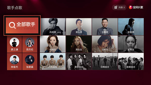 1、在电视上装好全民K歌TV版之后,打开就能直接在点歌台里找歌唱了。它提供了好几种点歌方式,像是拼音搜索、按歌手点歌、手机扫码点歌还有按分类点歌;