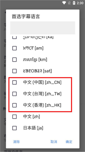 5、点开后会有一个语言列表,往下滑找到“中文(Chinese)”,把它勾选上,然后别忘了点右下角的“确定”。