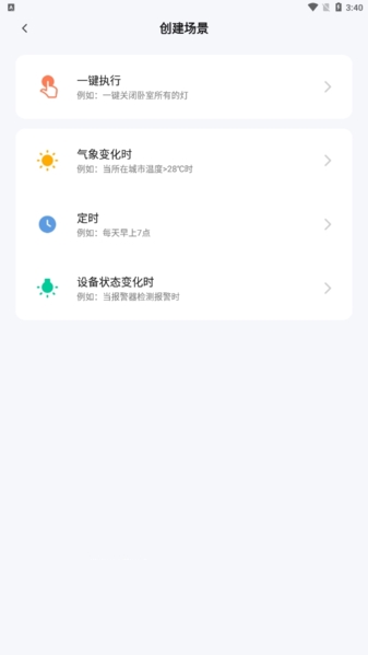 4、创建场景的第一步,是先选一个触发条件。比如天气变了(下雨了自动关窗),或者到了某个固定时间,再或者某个设备状态变了(门一开灯就亮)。