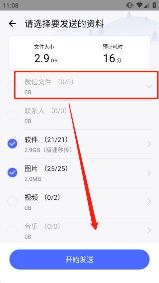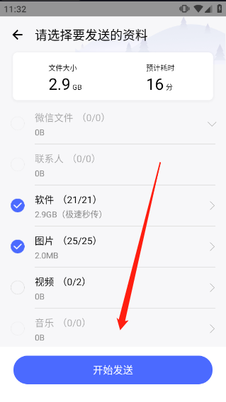 2、勾选你想要传到新手机的资料,比如联系人、照片等,然后点「开始发送」。