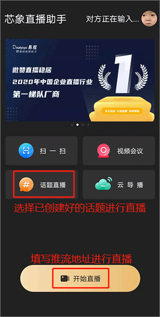 2、登录成功后,主界面就很直观了。你可以点【开始直播】,自己填推流地址开播;或者你要是参加特定活动,就直接在【话题直播】列表里找到你的那场点进去就行。