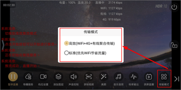 4、进了直播间之后,要是感觉网络不太对,随时可以点【传输模式】来调整。它默认是“高效”模式,如果你的网一般,手动改成“标准”模式会更稳妥。