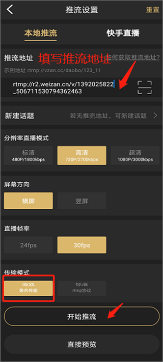 3、如果是自己开播,就要填一下推流地址,然后设置下直播画面的清晰度、横屏还是竖屏、帧率这些参数。划重点,那个传输模式可以根据你的网络情况选。都搞定之后,点【开始推流】就完事了。