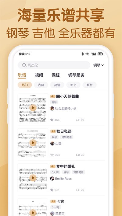 1、里面的谱子种类多到不行,不管你是玩啥乐器的,基本都能找到自己需要的谱子来练习,选择困难症都要犯了。